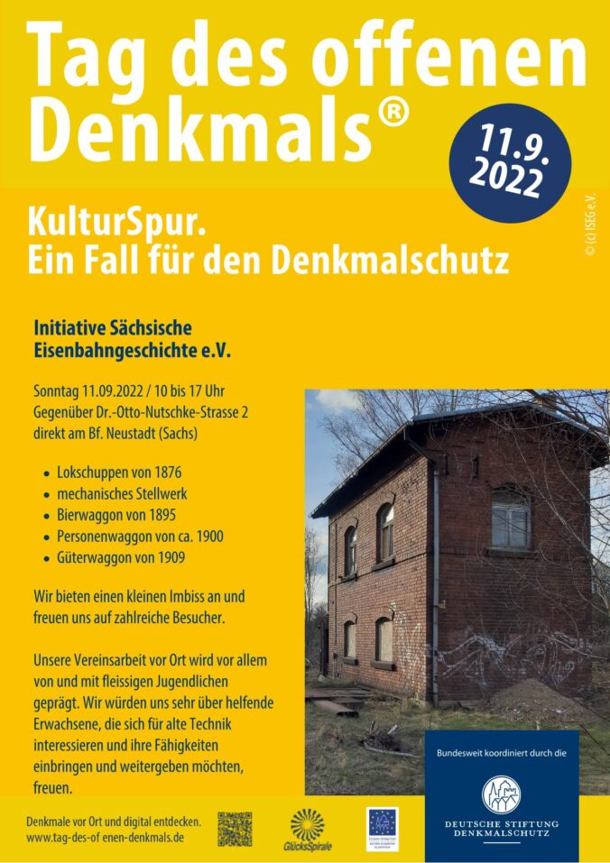 Auch beim diesjährigen Dresdner Dampfloktreffen war die ISEG wieder im vom Verkehrsmuseum Dresden (VMD) genutzten „Haus 4“ des ehemaligen Bahnbetriebswerkes Dresden-Altstadt mit einem Infostand präsent. Die Arbeitsgruppe Dresden, die mit dem VMD einen zu Zeiten als eigenständiger Verein „Eisenbahn- und Industriegeschichte Friedrichstadt e.V.“ (EIF) abgeschlossenen Betreuungsvertrag für die „Schleizer Wagen“ laufen hat, gab zur Schleizer Kleinbahn und zu diesen Fahrzeugen Auskunft. Der Erlös der am ISEG-Infostand verkauften Bücher, Winkerkellen und Kalendern der DAMPFBAHN-ROUTE Sachsen kam dem Vereinskonto zugute. Infostand der ISEG beim Dresdner Dampfloktreffen am 25. September 2022 vor den „Schleizer Wagen“ des VMD. Auf dem Messetisch der ISEG warb ein Modell des vereinseigenen 183er Personenwagens (Leihgabe eines Ausstellers) um zusätzliche Aufmerksamkeit.