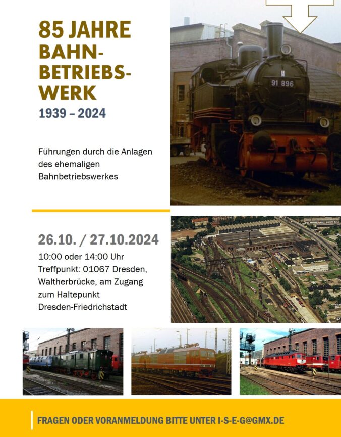 Aufgrund der großen Nachfrage gibt es nun anlässlich „85 Jahre Bw Dresden-Friedrichstadt“ zwei weitere Termine: das Wochenende 26./27. Oktober. Für die im Vergleich zum August vom Umfang erweiterten Führungen ist an beiden Tagen jeweils 10 Uhr sowie 14 Uhr Beginn. Treffpunkt für die zweistündigen Rundgänge ist an diesen beiden Tagen NICHT das Pförtnerhaus an der Hamburger Straße 39b, sondern jeweils die Waltherstraßenbrücke über die Gleise des Bahnhofes Dresden-Friedrichstadt. Von dieser Brücke führen Treppen zum Bahnsteig der Haltepunktes Dresden-Friedrichstadt.